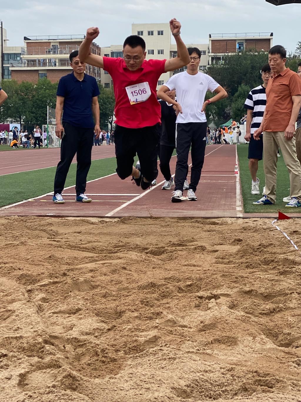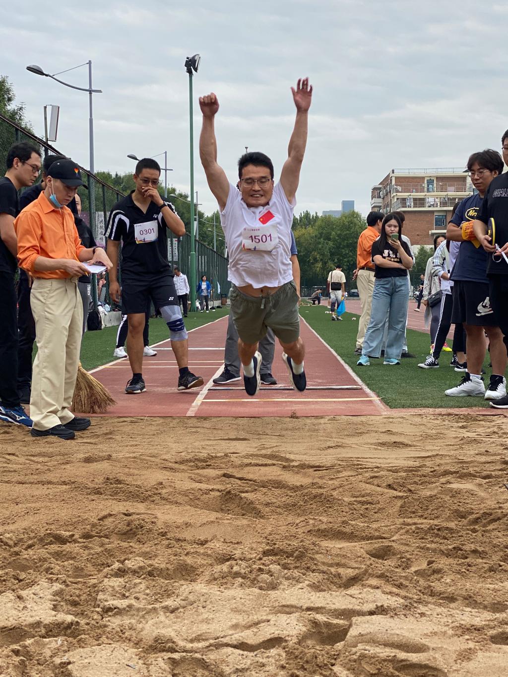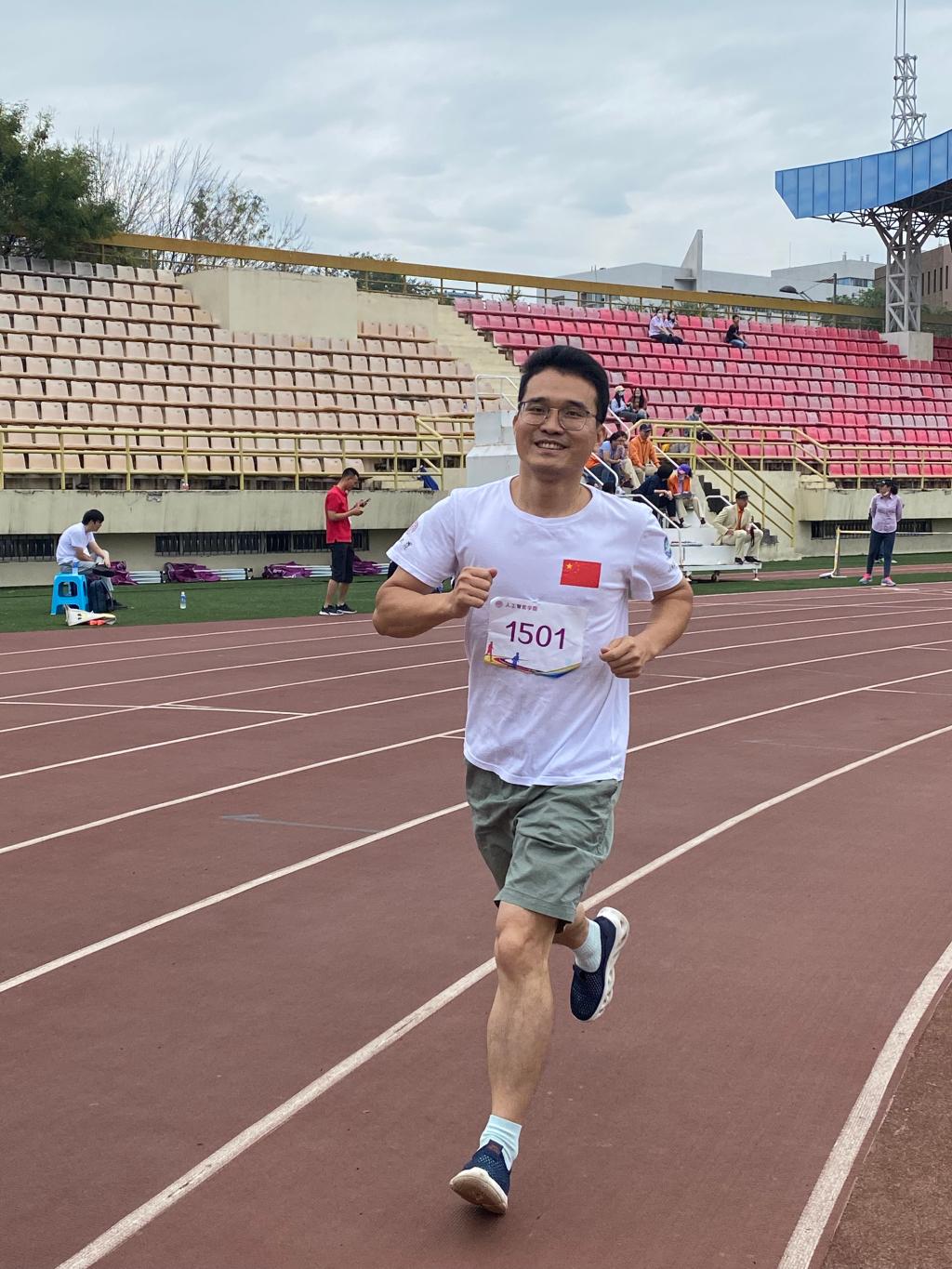 在雨后清凉的赛场,在微湿的跑道,比赛正式开始。虽然天公不作美,但是老师们的参赛热情丝毫不减,“赓续百年初心,担当育人使命”,醒目的横幅标语,提醒着大家教书育人不仅要专业素质过硬,还要德体全面发展。老师们在体育竞技中尽展人工智能的蓬勃朝气与青春活力。