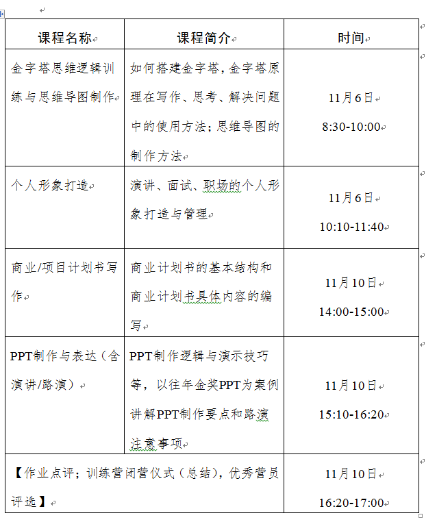 邀请校内外青年创客、投资人等,从基础逻辑思维训练,到PPT、商业计划书等制作方法,再到个人形象打造与演讲表达实战,帮助员工掌握应对大赛、路演、面试等各类场景需求的方法。