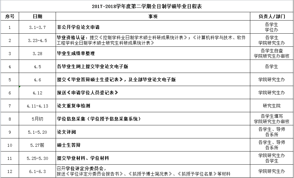 2017-2018学年度第二学期全日制研究生毕业日程表